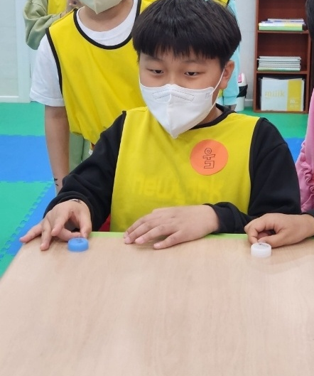 간단하지만 게임을 진행해보니 아이들의 몰입도가 아주 좋았고 손목 힘조절을 잘해야만 내가 원하는 위치로 병뚜껑을 보낼 수 있고 운적인 요소도 작용하기 때문에 아이들과 하기에 아주 좋은 놀이입니다.