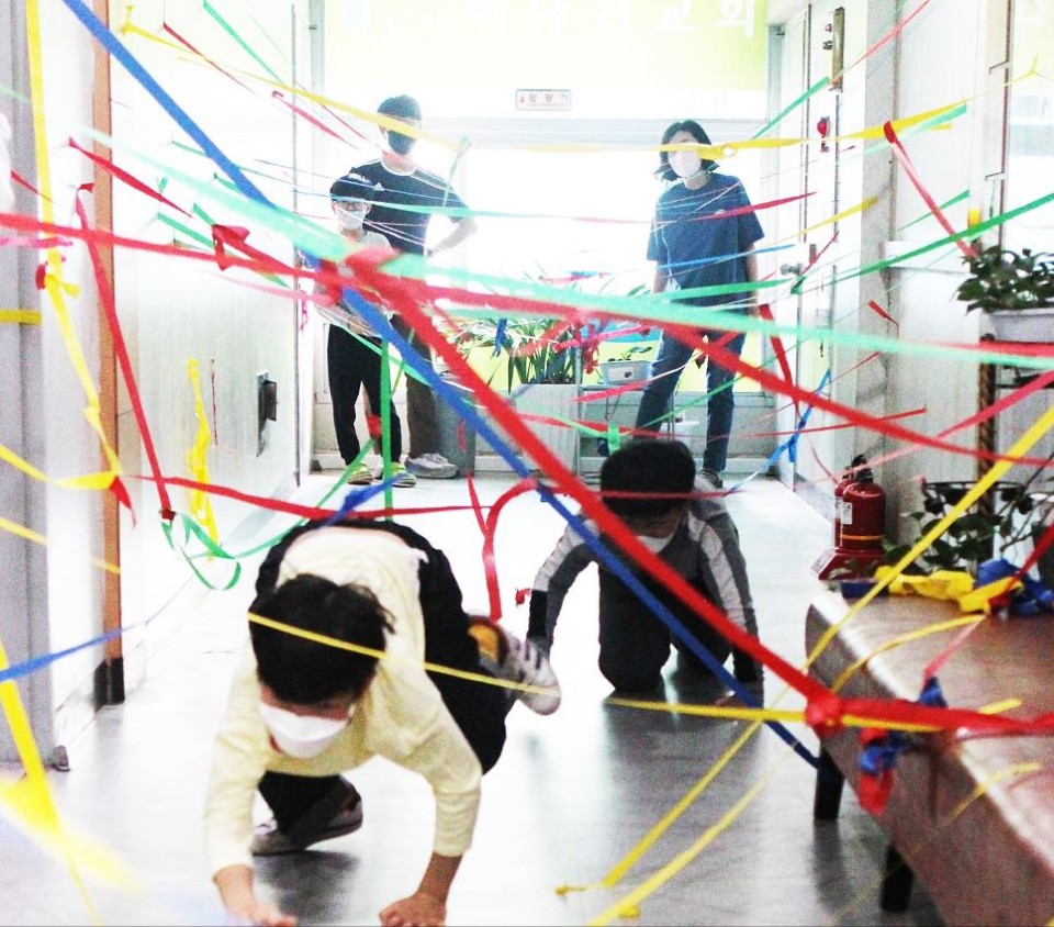 마스킹 테이프를 활용한 놀이는 매트리스 영화를 떠올리면 된다. 긴 복도에서 하기 좋은 놀이이다. 복도를 예로 들었을 때 시작과 끝부분을 정하고 아이들과 함께 다양한 색상의 마스킹 테이프를 복도의 왼쪽에서 오른쪽으로 길게 늘어뜨리면서 붙여주면 된다. (너무 팽팽하게 붙여주면 놀이하면서 테이프를 몸에 닿지 않고 빠져나가야 하므로 최대한 늘어지게 붙여준다)