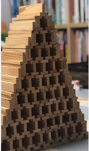 팔각기둥의 탑을 쌓아가면서 높게 쌓다가 사람 한명이 들어가서 앉고, 계속 이어서 쌓아주면 하나의 집이 완성됩니다. 많은 양의 나무 블록이 필요하지만 숲체원에서 하는 가족 놀이 중 가장 인기있는 프로그램입니다.