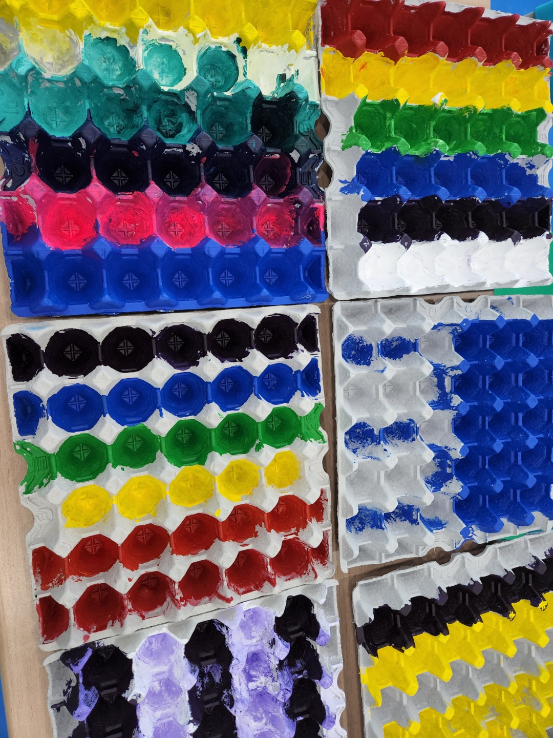 계란판 놀이를 시작하기 전에 색칠하는 활동을 준비하였습니다. 30개 달걀판 홈에 아이들이 직접 규칙을 정하여 색을 칠하였습니다. 붓에 물감을 칠해 계란판을 꼼꼼하게 칠하면서 아이들은 스트레스를 해소하였습니다.